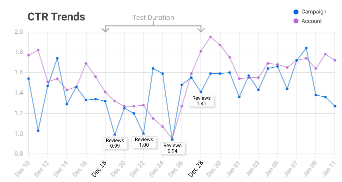 Do you see the blue valleys? Every 2 days, the CTR dropped. And these drops corresponded with the time the reviews catalog was live — it was evident pretty quickly as to which messaging wasn’t working and which was.
