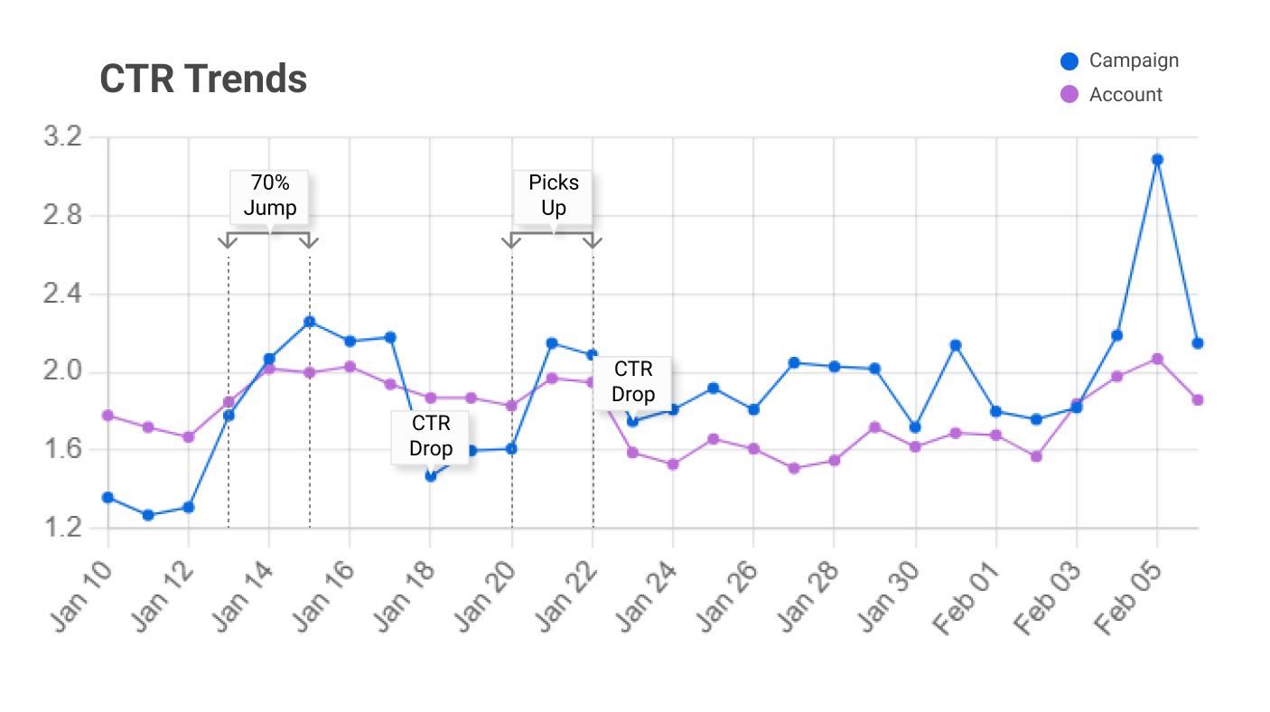 This is what the CTR graph looked like at the end of the 10-day period. The blue line traces the performance of the DABA campaign and the purple traces the account CTR over the same period. This helps track how the campaign trended with relation to the overall account performance.