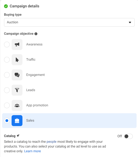 The best use of your ad money here is to drive the most number of conversions, or sales, in the shortest amount of time. The right objective here will be “Sales”.