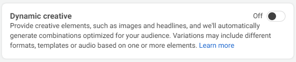 TIP: We usually recommend that you start your ads with this setting turned off. This will help you get an idea of how you can build ads on Facebook, what works for your audiences, as well as all the options Meta provides for customization. Once you get familiar with Meta ads, you can create new ads and test dynamic creatives to see whether or not they work for your brand.