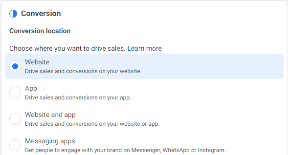 If you want to drive conversions on a website or an app, choose ‘Website’ or ‘App’, respectively. We recommend ‘Website’ for eCommerce stores to start with.