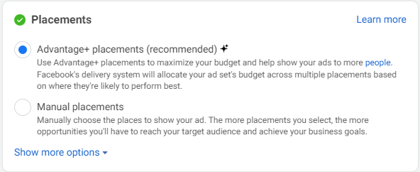 TIP: If you’re starting out, you can select the ‘Advantage+ placement’ which will make this automatic and Meta will decide where to deliver your ads and help maximize your ad performance.