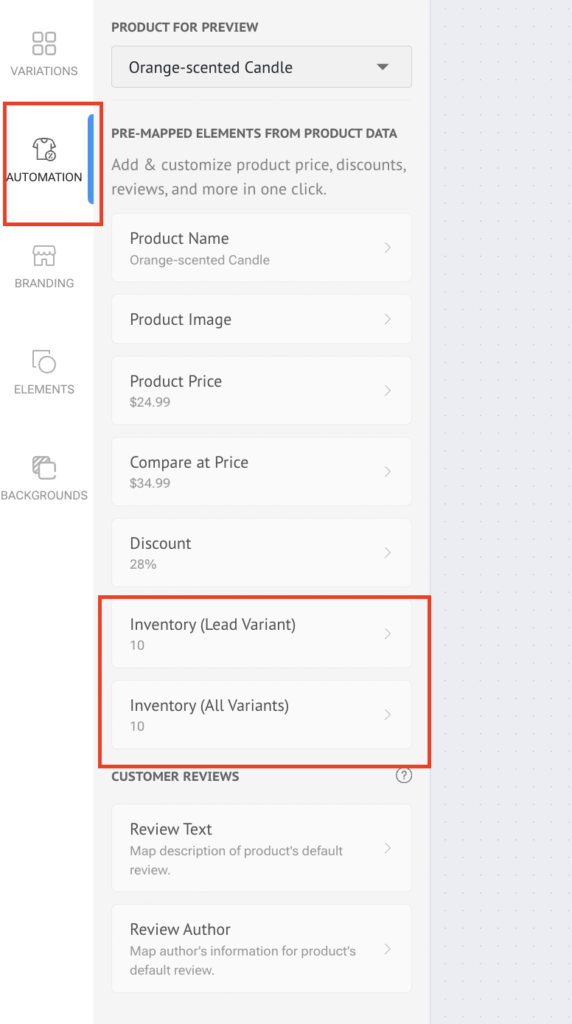 - Dynamic Inventory Mapping (example below): You can add inventory mapping using our pre-mapped elements.