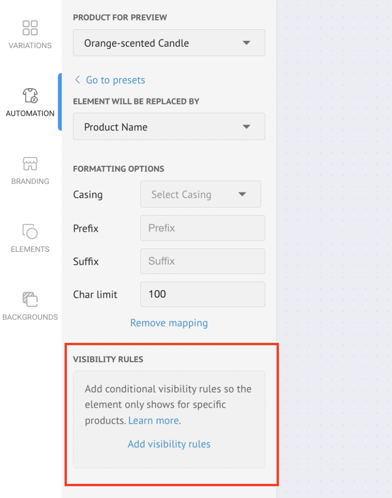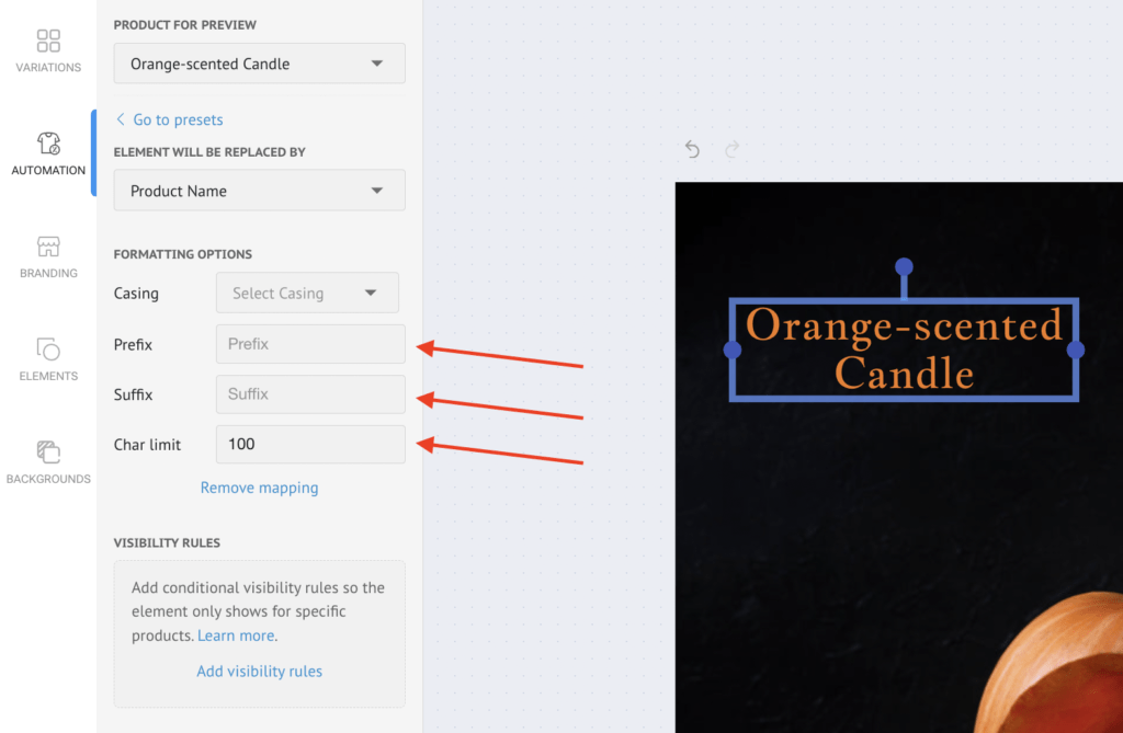 When the inventory mapped-text element loads into your canvas, make sure to add a “Prefix” or a “Suffix” like in the example below.