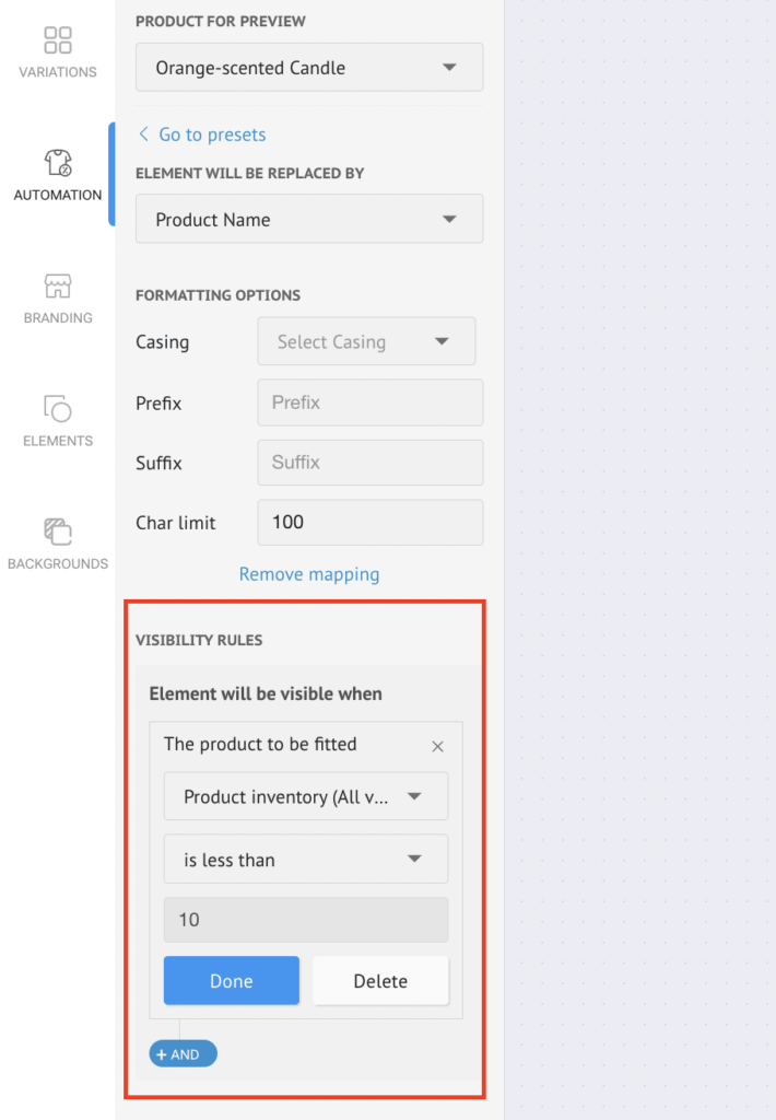 For this case, add a condition where the element shows only if Product inventory is lesser than 10. We’ve used 10 for demonstration but you can put any comparison threshold. - Click the blue “Done” button to save the condition.