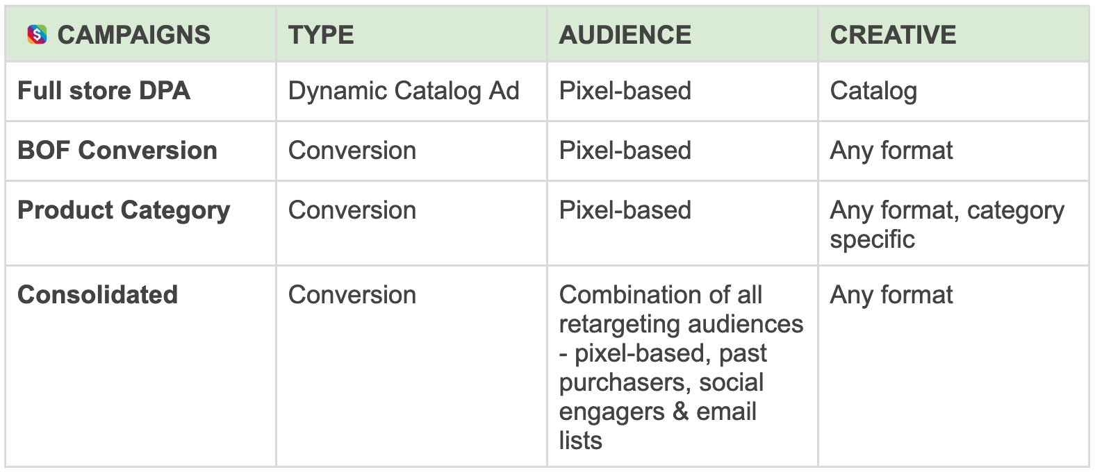 Target audience: Combination of all retargeting audiences – pixel-based, past purchasers, social engagers & email lists