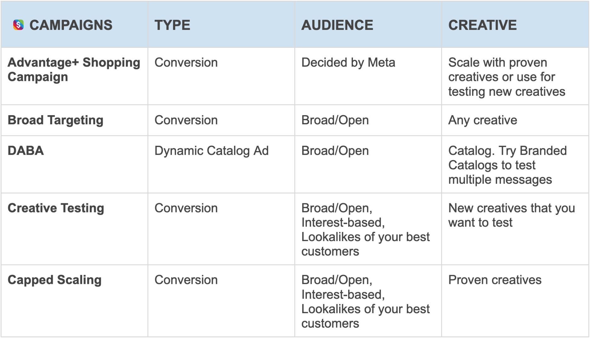 This is an advanced campaign ideal for experienced marketers and is used to scale your ad spend once you have a proved set of creatives.