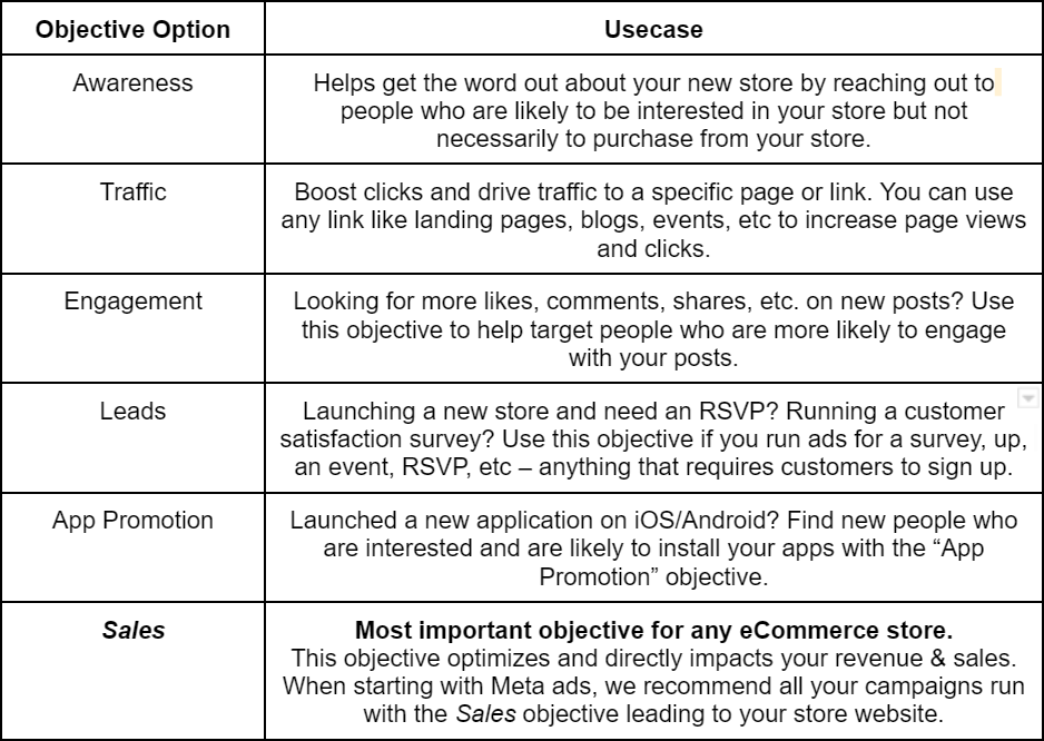 Here’s a table to look get a quick understanding of all the objectives that Meta provides for the campaigns. Based on your goals & business objectives, the right choice here will help optimize the right KPIs (key performance indicators).