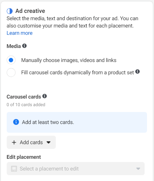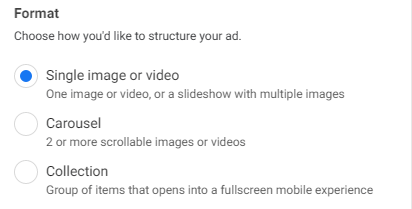 Ads can be of 4 types based on the media you want to use – single image or video ads, carousel ads, collection ads, or instant experience ads – all of which will have their own set of content, links, image/videos, etc. to enrich the ad.