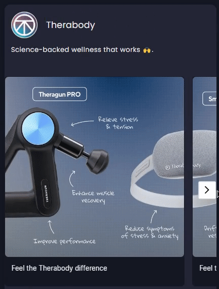 A dynamic carousel ad or a catalog ad, uses a product feed to pull in product data dynamically. Meta uses this to show users a personalized carousel of products that they are interested in based on their habits & engagements online.